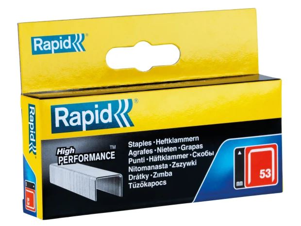 Rapid No. 53 precision cut fine wire staples are made from high-performance galvanised steel for strength and durability. The fine wire makes the fixed staple almost invisible, ideal for fabrics, decoration, small construction and light repair.