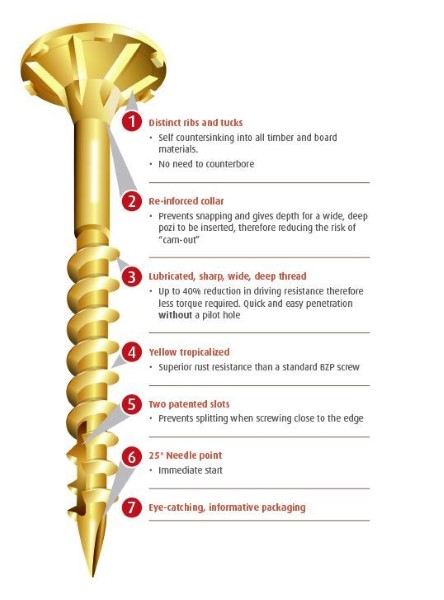 REISSER CUTTER Woodscrews represent the latest generation of technological excellence. They are uniquely designed to give ultimate performance and a perfect finish in all wood applications. The two patented slots (25mm and above) allow the screw to work closer to the edge without splitting, and the ribs and tucks under the head enable the screw to sit flush and tight without surface damage. The 20deg needle point gives the ability to penetrate almost all timbers without a pilot hole and the sharp, wide deep thread with unique lubrication gives up to 40% less driving resistance and easy penetration. The Yellow Tropicalized coating gives superior corrosion resistance (compared to a standard BZP coating) and the deep reinforced countersunk head recess allows the best possible fit to the driver bit, reducing “cam out” and providing extra strength at the critical junction between shank and head. Presented in eye-catching, informative packaging the CUTTER leads the way in premium High Performance Woodscrews.
