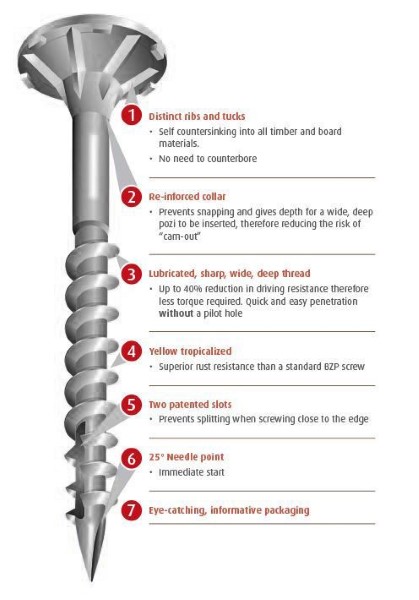 REISSER CUTTER BZP Woodscrews are produced as are all CUTTER Screws to give ultimate performance and a perfect finish in all wood applications. The deep reinforced countersunk head recess allows the best possible fit to the driver bit, reducing cam out and providing extra strength at the critical junction between shank and head. The two patented slots (25mm and above) allow the screw to work closer to the edge without splitting, and the ribs and tucks under the head enable the screw to sit flush and tight without surface damage. The 20deg needle point gives the ability to penetrate almost all timbers without a pilot hole and the sharp, wide deep thread with unique lubrication gives up to 40% less driving resistance and easy penetration. Supplied with a high quality Bright Zinc Plating to give the performance of CUTTER with a traditional finish.