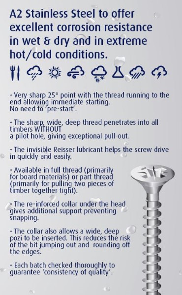 REISSER R2 RETINOX WOODSCREWS are manufactured to the same specifications as the R2 YZP screws to give consistent performance in all timbers and board materials. The use of A2 Stainless Steel offers high corrosion resistance in tough environments is ideal for sterile, hygiene applications and has resistance to chemicals/ dyes / foodstuffs. The self-colour stainless material is also gives an attractive finish if visible. The 25deg needle point gives the ability to penetrate almost all timbers without a pilot hole and the sharp, wide deep thread with unique lubrication gives up to 40% less driving resistance and easy penetration and offers exceptionally high pull out resistance. The deep reinforced pozi drive countersunk head recess allows the best possible fit to the driver bit, reducing cam out and providing extra strength at the critical junction between shank and head.