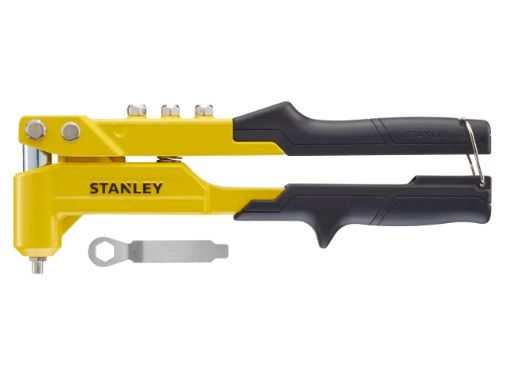 This Stanley MR100 contract grade, heavy-duty, long-lasting all-steel riveter is supplied with 4 nosepieces and a wrench store in the handle for versatility and convenient storage.