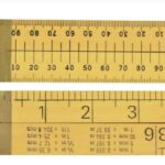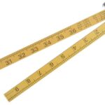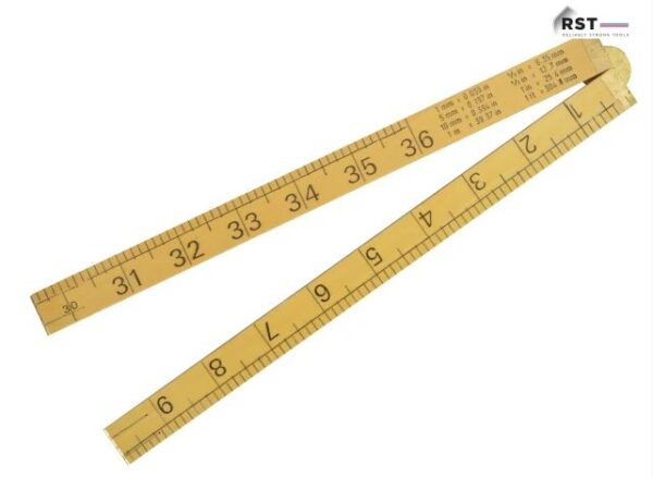 A hardwood four-fold rule with brass hinges and brass end caps. English imperial markings one side and metric markings on the other.