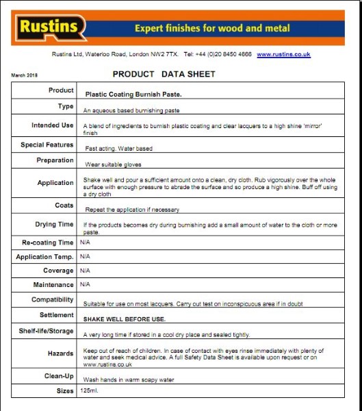 Rustins Burnishing Cream/Paste is a polishing compound that can be used with other Rustins kits, or on a variety of surfaces including plastics and metals (particularly chrome). It is the burnishing cream sold in the plastic coating kits, and has been requested as a separate item by many people. Simply shake the bottle well, apply burnishing cream with a soft, damp pad, and commence polishing using firm pressure. Apply additional cream as needed and decrease pressure as you near the end of your task. Finish the job with a quick buffing with a clean, soft cloth (such as our flannel polishing cloths). It may be applied by hand using a soft cloth or with an electric buffer, though in the latter case it may be advisable to add a bit of water to prevent the paste from drying too quickly. Size: 63ml.