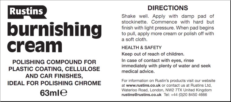 Rustins Burnishing Cream/Paste is a polishing compound that can be used with other Rustins kits, or on a variety of surfaces including plastics and metals (particularly chrome). It is the burnishing cream sold in the plastic coating kits, and has been requested as a separate item by many people. Simply shake the bottle well, apply burnishing cream with a soft, damp pad, and commence polishing using firm pressure. Apply additional cream as needed and decrease pressure as you near the end of your task. Finish the job with a quick buffing with a clean, soft cloth (such as our flannel polishing cloths). It may be applied by hand using a soft cloth or with an electric buffer, though in the latter case it may be advisable to add a bit of water to prevent the paste from drying too quickly. Size: 63ml.