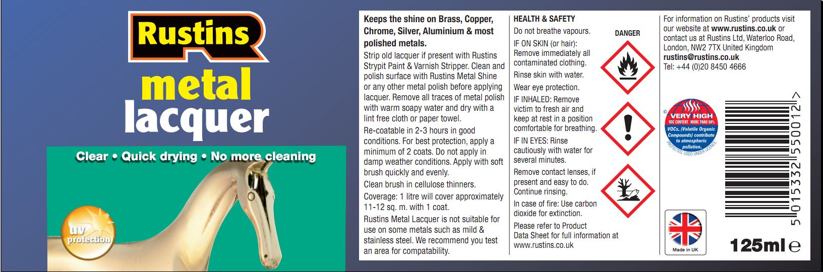 Rustins Metal Lacquer – clear lacquer that leaves a film that does not yellow or craze on ageing. Has excellent adhesion on chrome, brass, copper and silver. No more cleaning