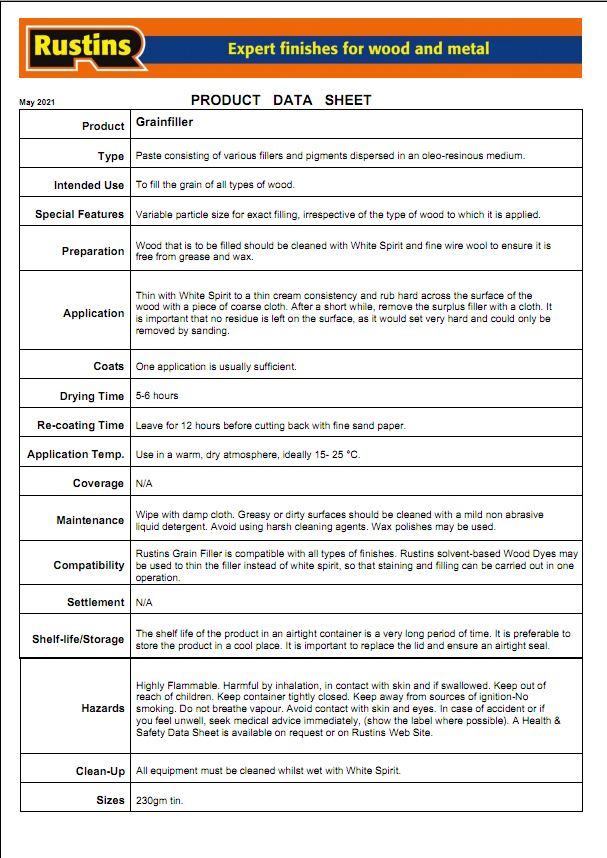Rustins Grain Filler is supplied as a paste which is thinned with white spirit for use. It is applied to wood before finishing to fill the pores, preventing sinking of the finish. The Mahogany Shade can be thinned with Rustins Wood Dye so that filling and staining can be carried out in one operation