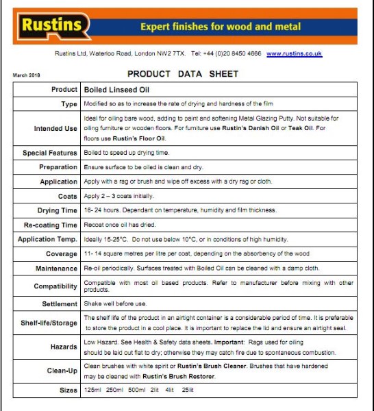 BOILED LINSEED OIL Boiled linseed oil is used for finishing most bare timber and suitable for replacing the natural sheen that wood can lose after long periods drying in the sun. Boiled linseed oil contains special additives which speed the drying process.