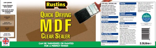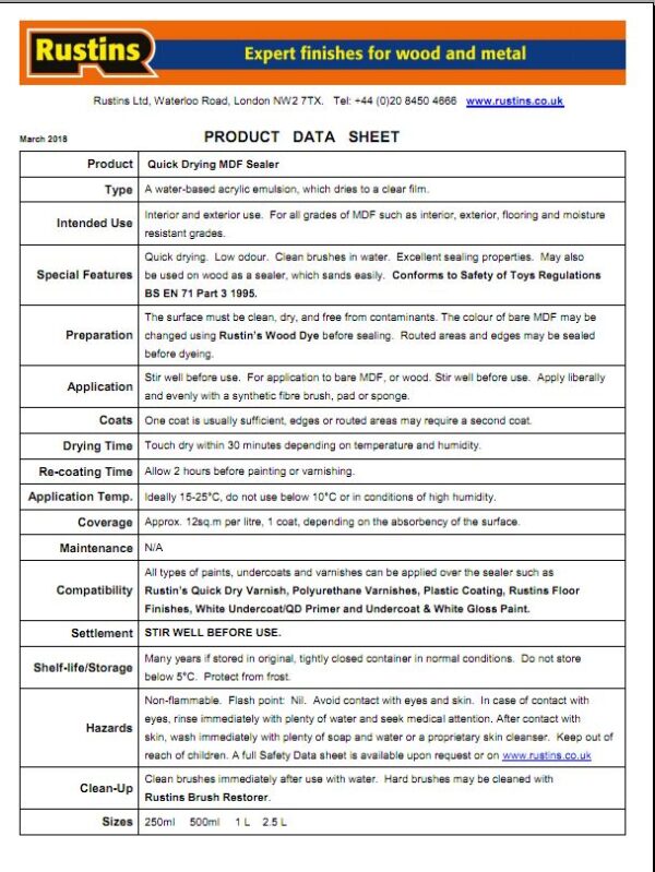 Rustins MDF Sealer is a quick drying, clear sealer that allows the application of both paints or varnishes, unlike white MDF sealers which can only be painted. Touch dry in 30 minutes and can be re-coated in 2 hours. Clean brushes in water