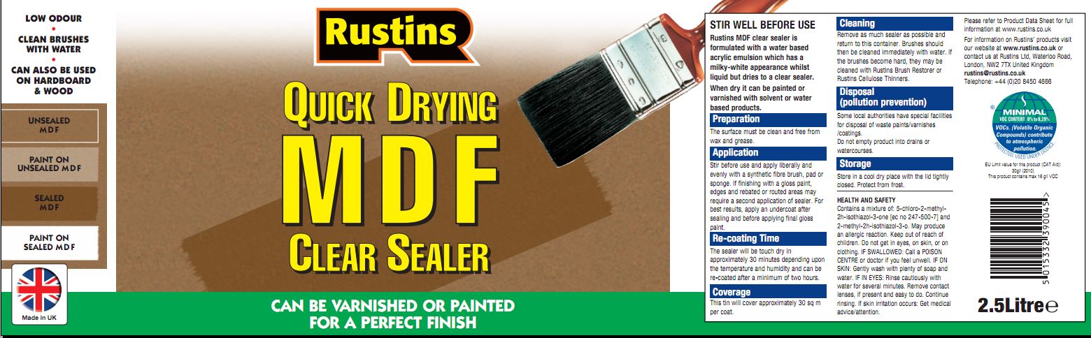 Rustins MDF Sealer is a quick drying, clear sealer that allows the application of both paints or varnishes, unlike white MDF sealers which can only be painted. Touch dry in 30 minutes and can be re-coated in 2 hours. Clean brushes in water