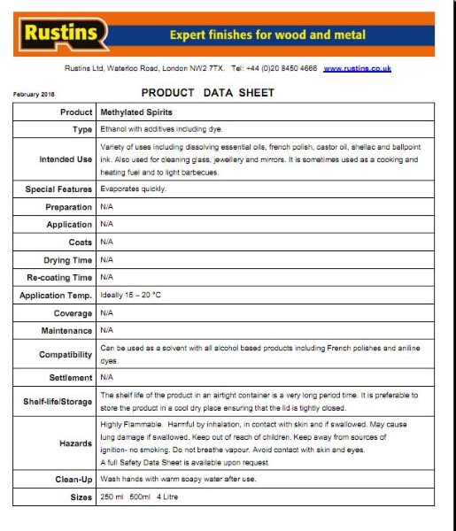 METHYLATED SPIRITS – Used for thinning french polishes and shellac varnishes, for use in spirit burning heaters, stoves and for lighting barbecues. Cleans mirrors, glass and jewellery.