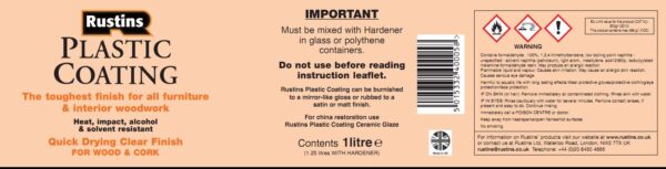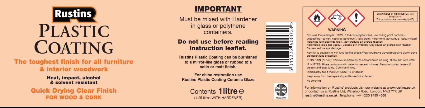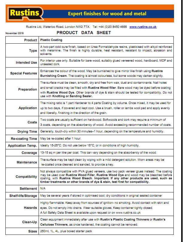 Plastic Coating – Two-part clear cold cure lacquer for use on wood, hardboard, cork and plastic laminates. Extremely good adhesion, resistant to heat, solvents and abrasion. Can be burnished to a mirror like gloss or rubbed down to a smooth, satin finish with steel wool and wax. An excellent finish for marquetry as it does not darken light coloured veneers and does not yellow or craze on ageing.
