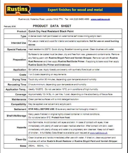QUICK-DRYING HEAT RESISTANT BLACK PAINT – Rustins Heat Resistant Paint is based on a high quality water-borne, cross-linking acrylic resin. It is a low VOC paint for use on metal and wood and on both exterior and interior surfaces. The maximum heat resistance is approximately 220degC.