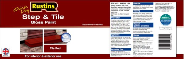 Rustins Quick Dry Step & Tile Gloss Paint is a quick drying high performance interior and exterior paint for use on tiles, concrete and bricks. Not for use on glazed or quarry tiles.