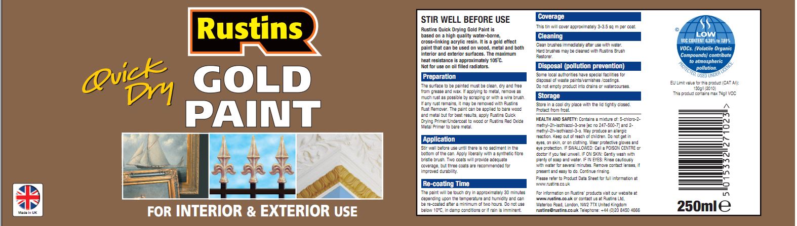 Rustins Quick Drying Gold Paint. Suitable for interior & exterior use. Touch dry in 2 hours. May be applied to wood and metal and over painted surfaces. Clean brushes in water