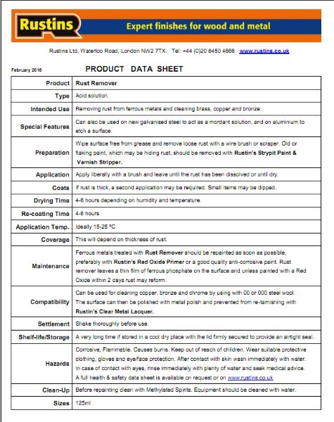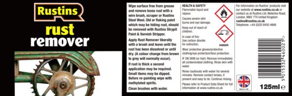 Rustins Rust Remover removes surface rust from mild steel and iron products. Ideal for use on garden gates, bicycles, cars and all metal objects around the home
