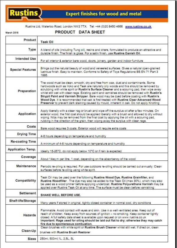 High quality teak oil. Rustins Teak Oil is a special blend for use on unpolished wood surfaces, indoors and outdoors, where the natural oils have been removed by weathering, This teak oil will prevent wood drying, warping and splitting