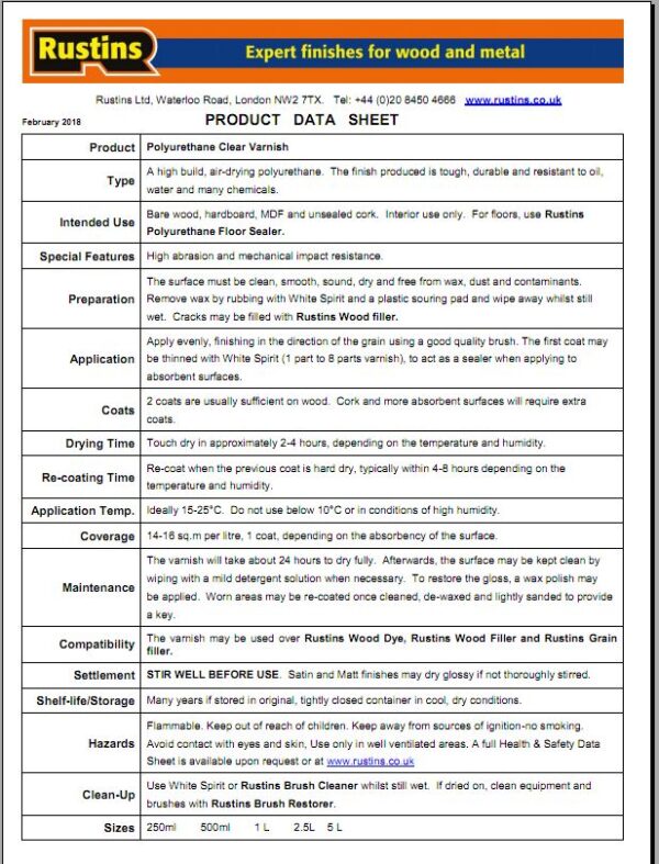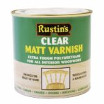 Rustins Clear Matt Polyurethane Varnish for interior use. A tough and durable finish for all woodwork and cork. Apply 2-3 coats for the perfect finish. Re-coating time 2-8 hours. Can also be applied over Rustins Wood Dyes. Matt finish. 500ml.