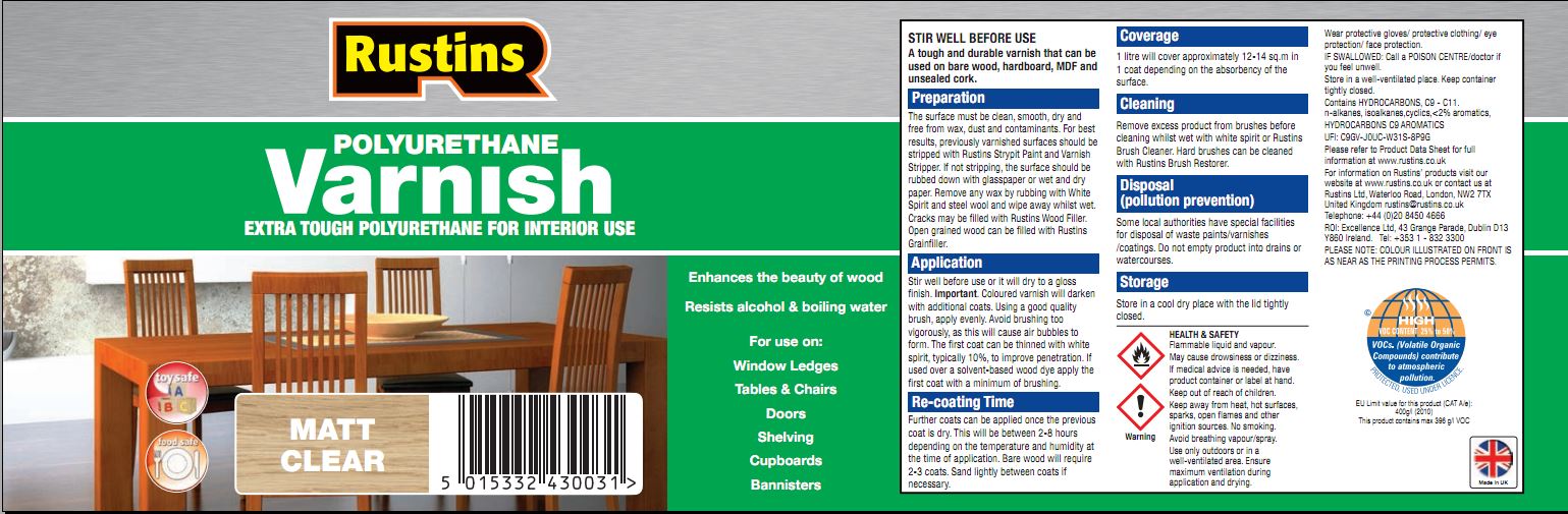 Rustins Clear Matt Polyurethane Varnish for interior use. A tough and durable finish for all woodwork and cork. Apply 2-3 coats for the perfect finish. Re-coating time 2-8 hours. Can also be applied over Rustins Wood Dyes. Matt finish. 500ml.