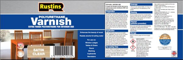 Rustins Clear Satin Polyurethane Varnish for interior use. A tough and durable finish for all woodwork and cork. Apply 2-3 coats for the perfect finish. Re-coating time 2-8 hours. Can also be applied over Rustins Wood Dyes. Matt finish. 500ml.