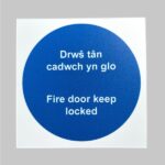 Fire door keep locked Drws tan cadwch yn glo with Welsh and English translation, has a peel and stick, self adhesive backing for easy application on many surfaces.