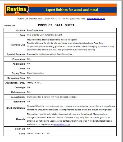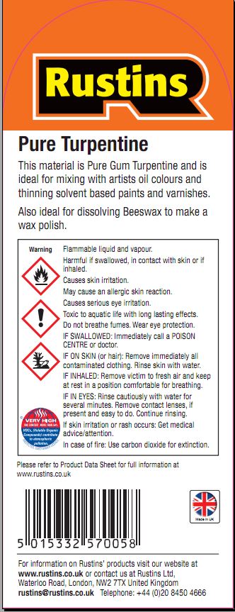 PURE TURPENTINE – Is used for mixing artists oil colours. Ideal for dissolving beeswax to make a wax polish.