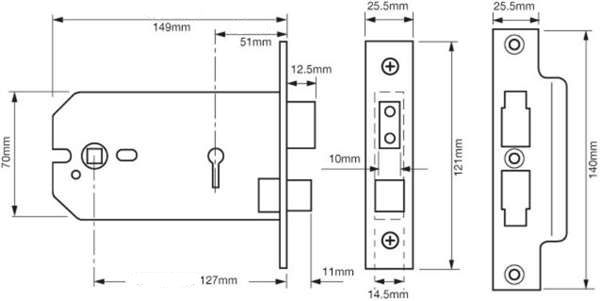 3 Lever Hor. Mortice Sashlock (6). Suits wooden doors hinged on the left or right and requiring key and handle operation. Two way action suitable for knobs or sprung lever handles. Deadbolt locked or unlocked by key from either side. Latchbolt withdrawn by knob or sprung lever handle from either side. Pierced to accept bolt through furniture.