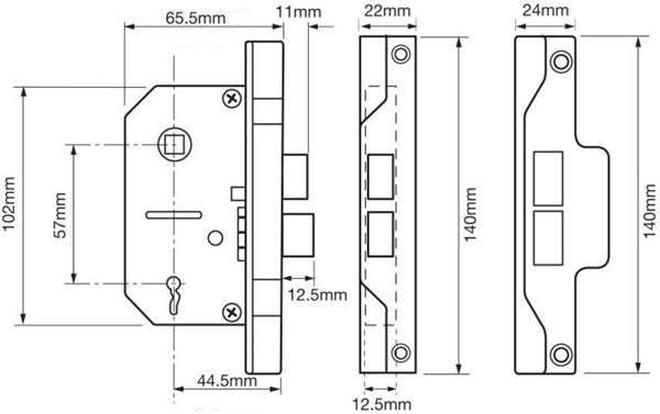 Two way action suitable for lightweight knobs or sprung handles. Deadbolt locked or unlocked by key from either side. Latchbolt withdrawn by lever handle from either side. Keys suitable for doors upto 55mm thick when using 8mm thick furniture plates.
