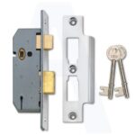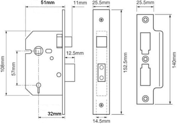 Deadbolt locked or unlocked by key from either side. Latchbolt withdrawn by lever handle from either side. Pierced to accept bolt through furniture.