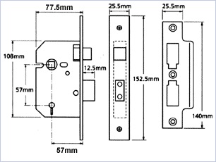 Deadbolt locked or unlocked by key from either side. Latchbolt withdrawn by lever handle from either side. Pierced to accept bolt through furniture.