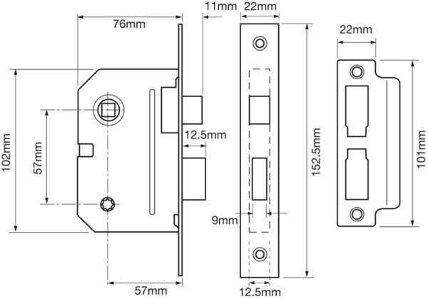 Contract Lever Mortice Bathroom Lock (3). Two way action suitable for lightway knobs or sprung handles. Deadbolt locked or unlocked by separate turn from inside. Deadbolt unlocked by separate emergency release from outside. Latchbolt withdrawn by lever handle from either side. Not suitable for unsprung lever handles. 57mm Centres 5mm T/Turn Follower 57mm Backset 76mm Case Depth Brass Finish.