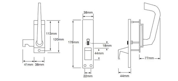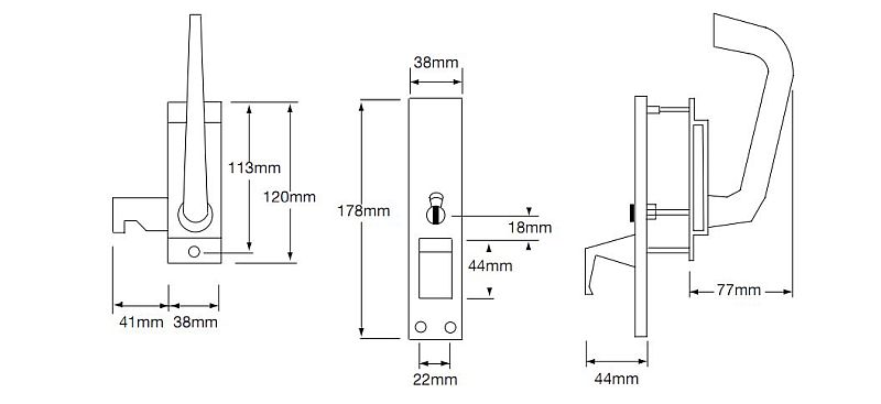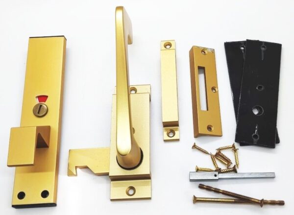 Indicator bolt (facility) right hand. Anodised gold. Complies with Doc M. Suitable for hinged or sliding doors. Surface mount. (Door hinge on right from inside). Can be re-handed by circlip removal and re-fit. Complete with mortice and surface keeps. Internal lever can be restricted to 30 or 90 degrees. External pull can be positioned at 0, 90, 180, or 270 degrees.