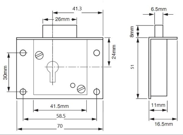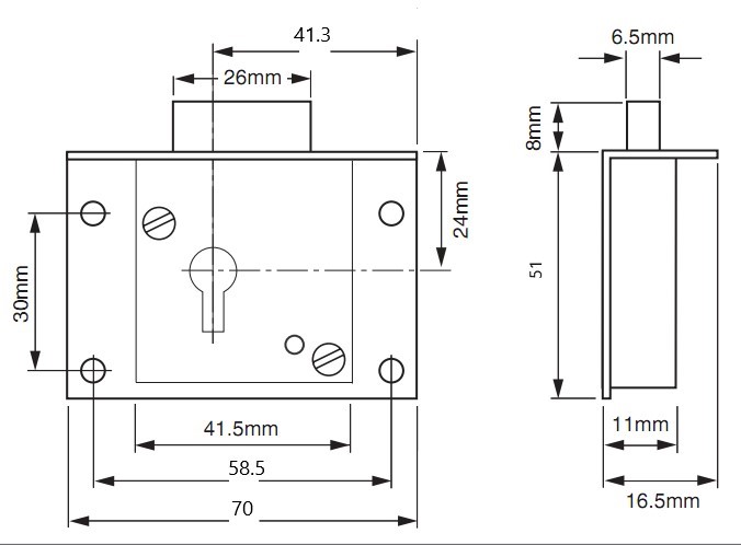 Drawer Lock Cut 4 Lever 70mm Brass.