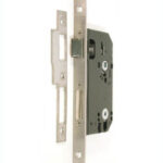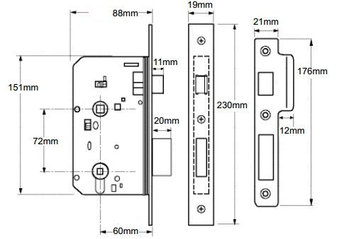 Mortice bathroom lock for wooden doors hinged on the left or right and requiring turn and emergency release functions. Double throw – 20mm throw with separate turn from inside. Deadbolt unlocked by separate emergency release from outside. Latch bolt withdrawn by lever handle from either side. Easily reversible latch bolt. Pierced to accept bolt through furniture. 72mm Centres 5 & 8mm T/Turn Follower 60mm Backset 83mm Case Depth 60mm backset. 72mm centres. Case only. Square forend. Satin stainles steel finish.