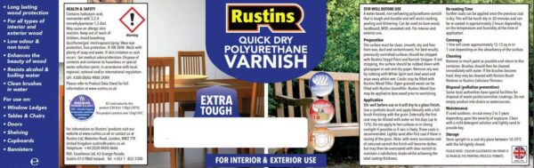Long lasting wood protection, for all types of interior and exterior wood, low odour & non toxic, enhances the beauty of wood, resists alcohol & boiling water