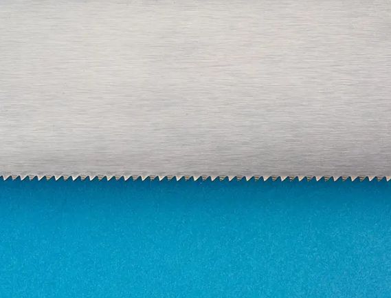 The 0.020″ thick high-carbon steel blade features 20 rip-cut teeth per inch, having 0.003″ of set per side. The teeth have a rake angle of 14 degrees and an included angle of 60 degrees.