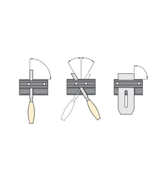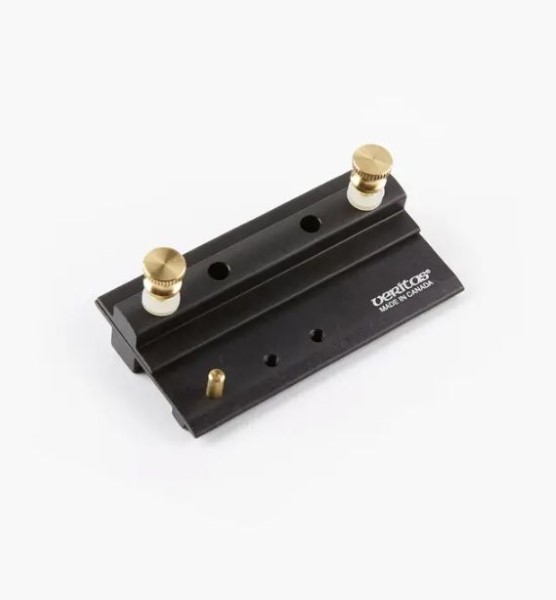 To be used in combination with a tool rest such as the Veritas Grinder Tool Rest. Square a tool in the jig against an alignment pin and clamping thumbscrew, adjust projection for bevel angle, and slide back and forth across the stone face to sharpen. Nylon washers prevent galling, high-friction pads ensure solid clamping. Anodized hard aluminum with solid brass clamping bolts.