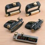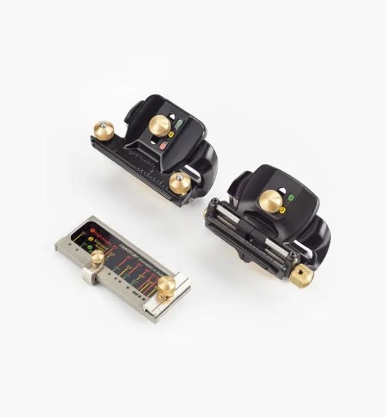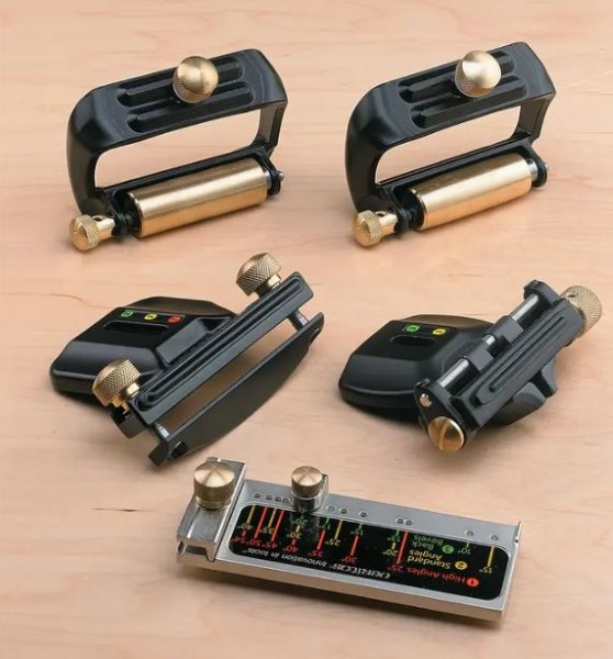 The deluxe honing guide set includes standard and narrow-blade clamping heads as well as an angle registration jig, a straight roller base and a camber roller base