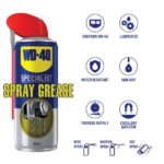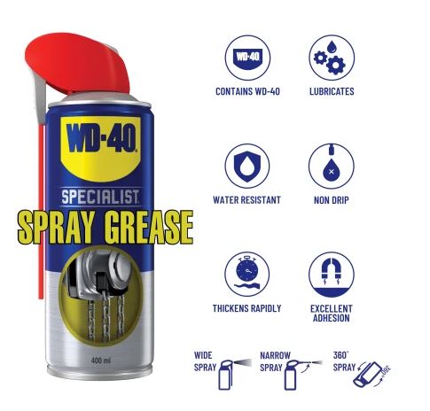 WD-40 Specialist® Spray Grease is a long-lasting, multi-purpose grease in a convenient spray format with excellent adhesion and sealing properties. WD-40 Specialist Spray Grease is ideal for use on moving metal components and machinery to prevent friction and wear. It delivers long-term lubrication making regular reapplication unnecessary and provides a water resistant, protective barrier preventing rust or corrosion forming.